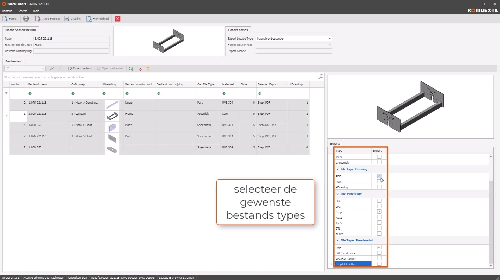 Met behulp van de Batch exports functionaliteit worden alle benodigde export bestanden automatisch aangemaakt. De assembly wordt automatisch doorlopen en bestanden zoals, PDF, DXF, DWG, STP, JPG, STL worden direct aangemaakt en gekoppeld aan het dossier voor later gebruik.