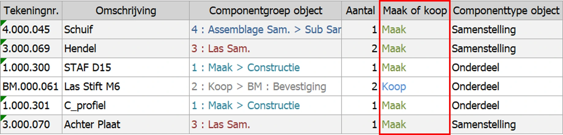 De mBom is voorzien van Maak- & Koopdelen kolom