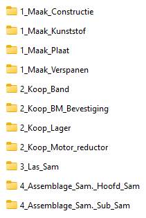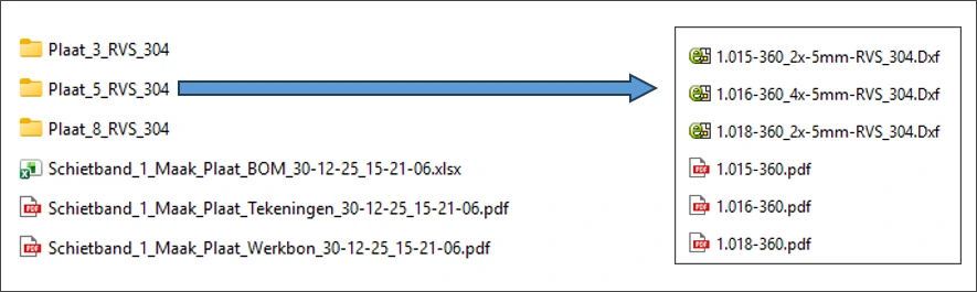 Voor plaatwerkwerkvoorbereiding worden exportbestanden zoals PDF, STEP en DXF automatisch verzameld en geordend in submappen per materiaal en dikte.