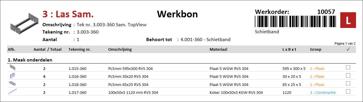 De werkbonnen geven inzicht in welke onderdelen en materialen nodig zijn binnen de lassamenstelling.