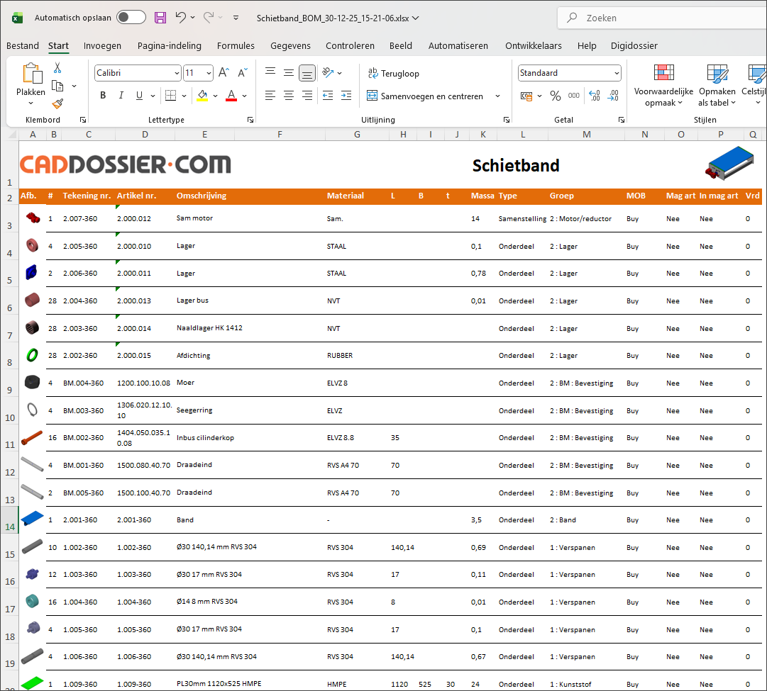 Overzichtelijke stuklijsten in Excel of PDF met alle koopdelen inclusief relevante specificaties. Eenvoudig te filteren op subsets, zoals alleen lagers, motoren of bevestigingsmateriaal.